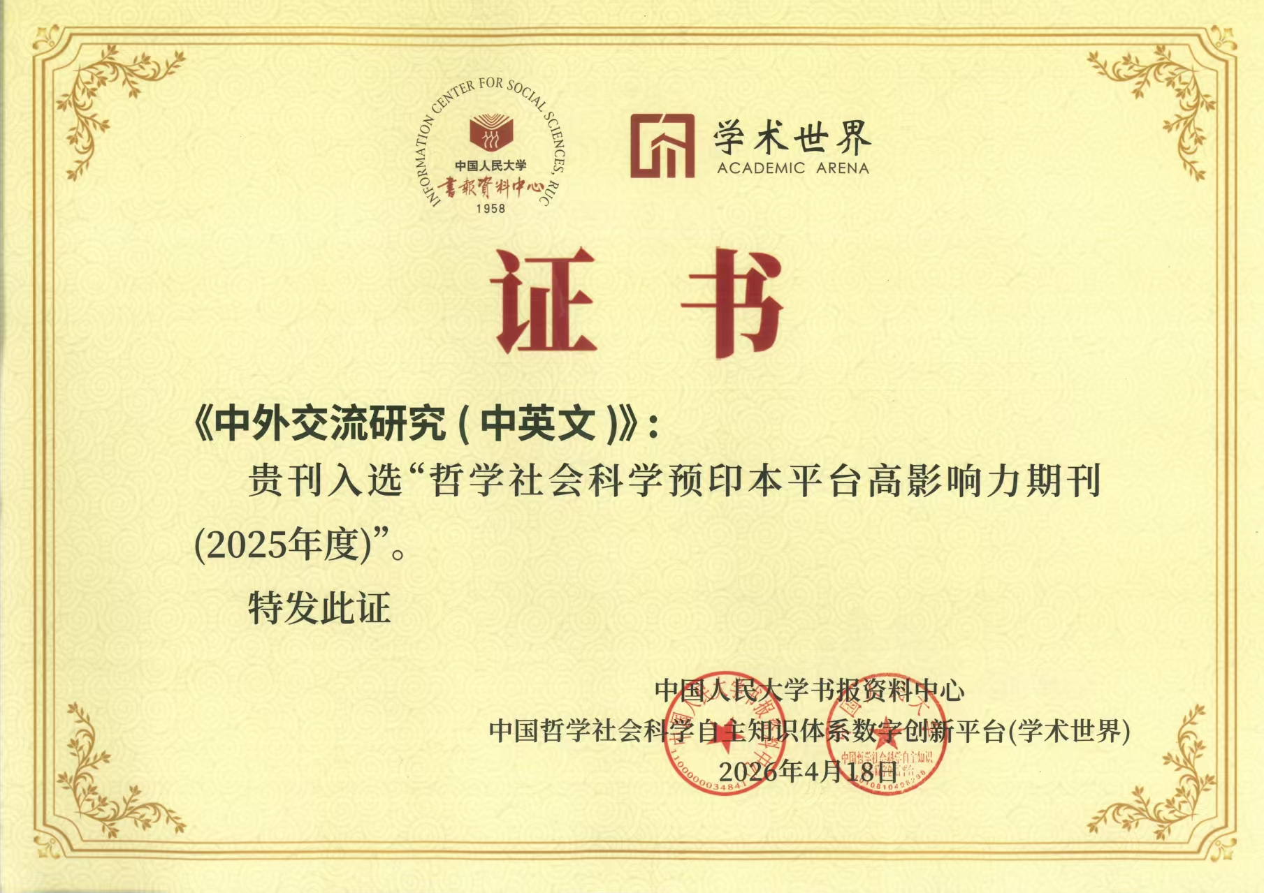 我校《中外交流研究(中英文)》入选“哲学社会科学预印本平台高影响力期刊(2025年度)”